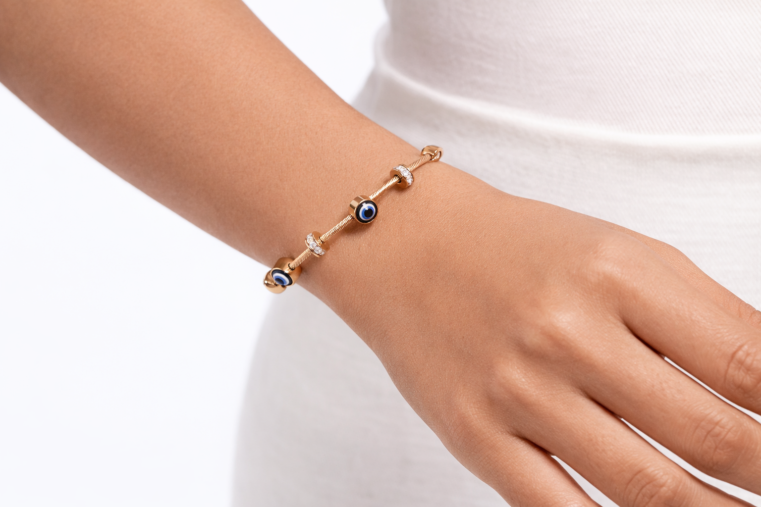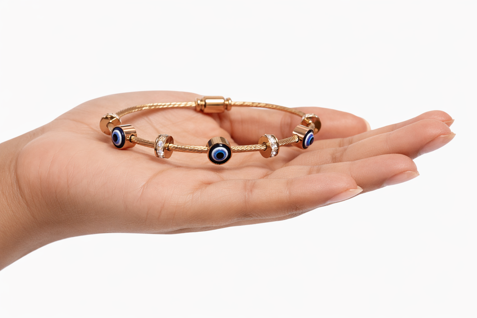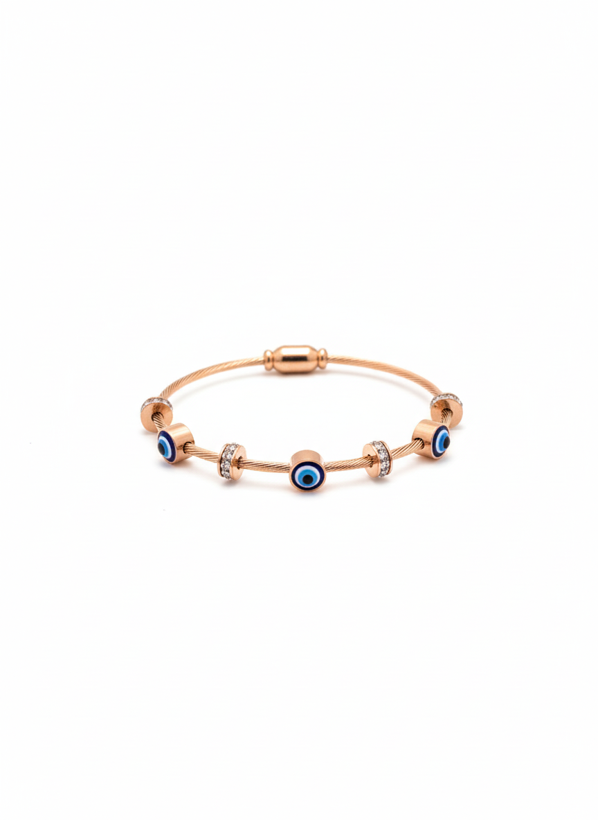 Add a touch of elegance and protection to your everyday style with this beautiful adjustable rose gold evil eye bracelet for women. Designed with a sleek cable-style band, this bracelet features multiple blue evil eye charms and sparkling crystal-studded accents that enhance its premium look. The evil eye symbol is believed to protect against negativity and bring good luck, making this bracelet both meaningful and fashionable.