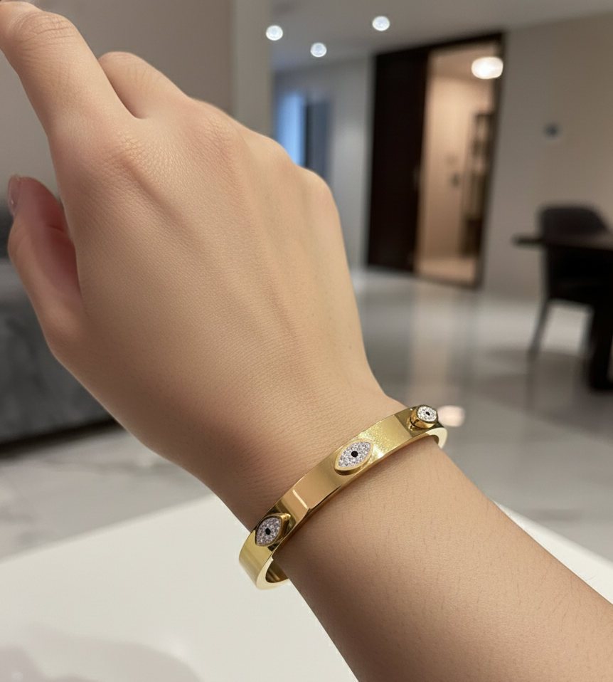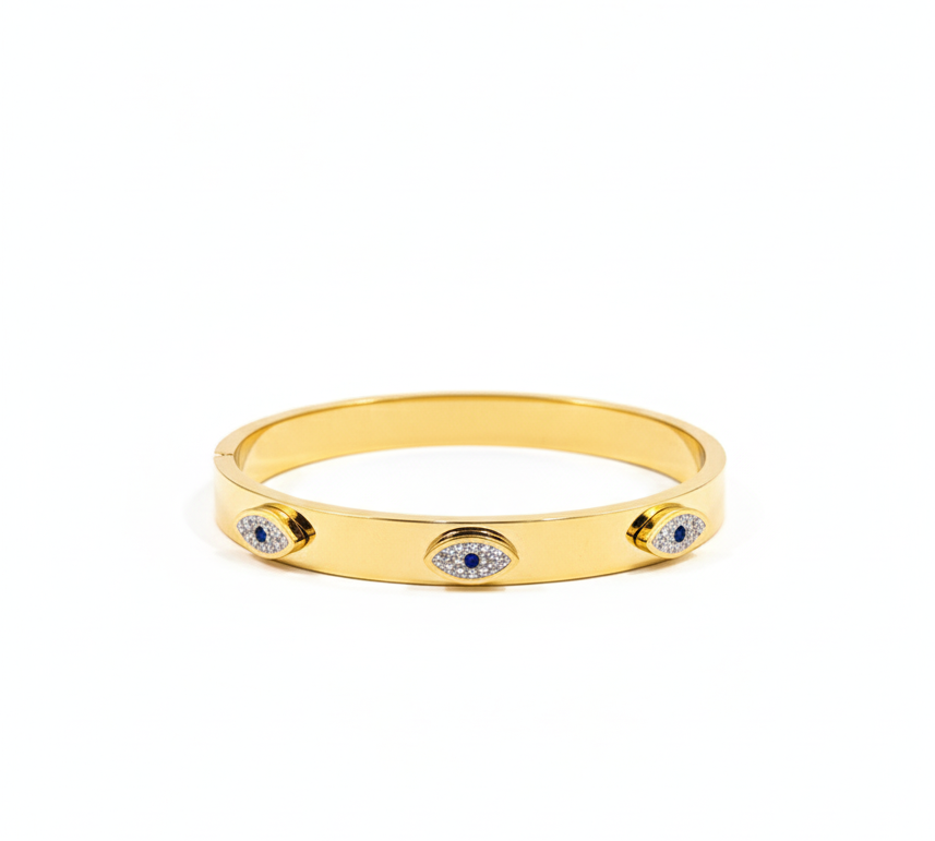 A stylish gold-finish women’s bracelet featuring elegant evil eye motifs with sparkling stones, perfect for everyday wear or special occasions. Designed to add charm, protection, and a premium look to any outfit.