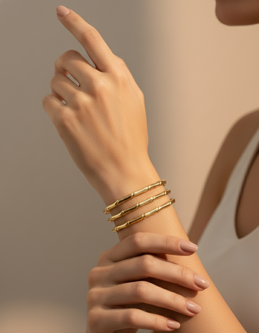 This elegant gold-tone adjustable bracelet is designed with a sleek bamboo-inspired pattern that adds a modern yet timeless charm to your jewellery collection. Crafted with a smooth, high-shine finish, the bracelet offers a premium look while remaining lightweight and comfortable for all-day wear. The open cuff adjustable design ensures a perfect fit for most wrist sizes, making it easy to wear and remove without any hassle. Ideal for daily wear, office looks, casual outings, or special occasions, this artificial bracelet pairs beautifully with ethnic as well as western outfits. Its minimal design makes it a versatile accessory and a thoughtful gifting option for birthdays, anniversaries, festivals, or celebrations.