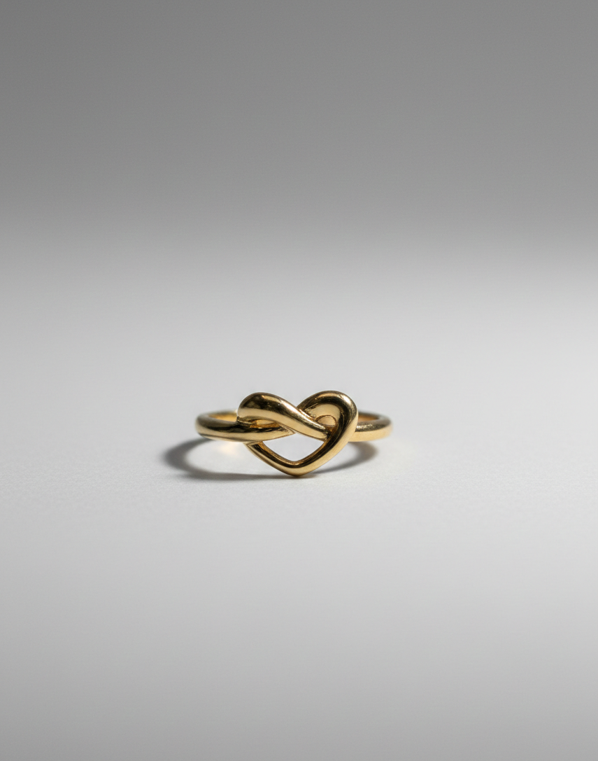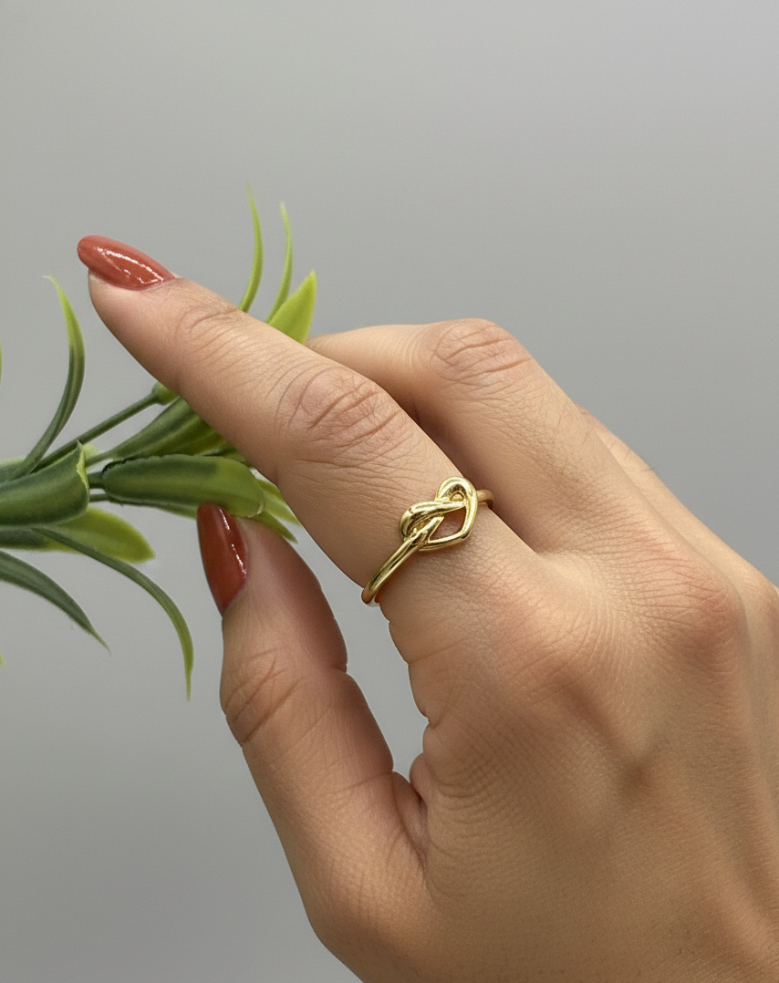 A stylish gold-finish adjustable ring featuring an elegant intertwined heart knot design. Perfect for daily wear, gifting, or stacking with other rings.
