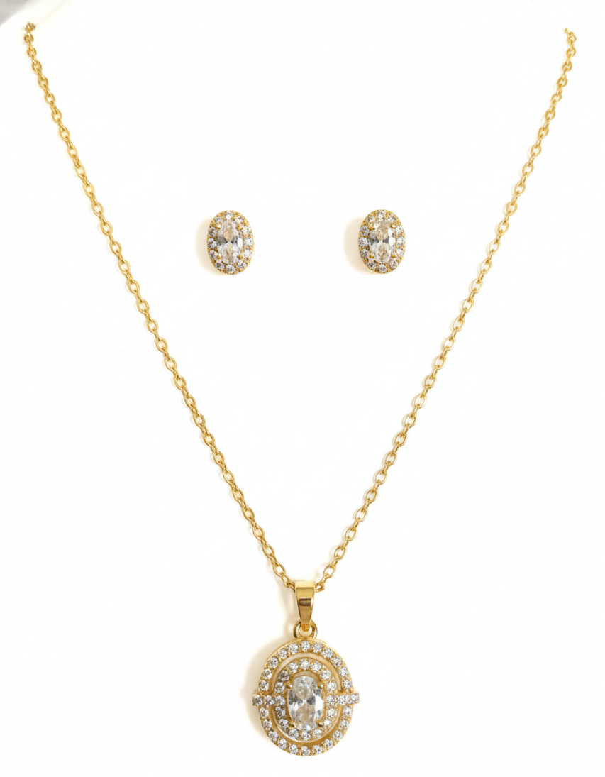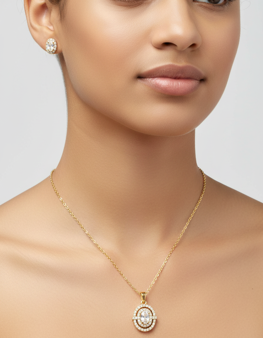 Elegant gold-plated necklace set featuring an oval crystal pendant with double-layer sparkle and matching crystal stud earrings. Perfect for daily wear, parties, and gifting.
