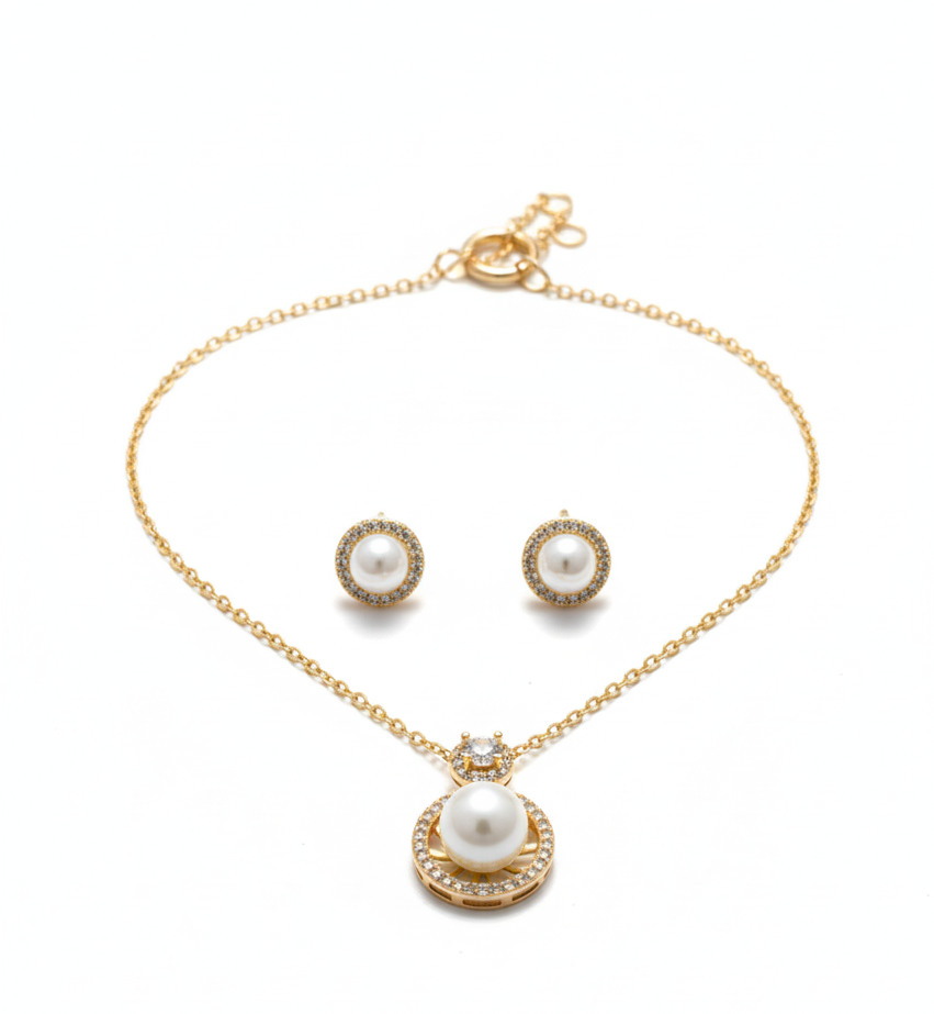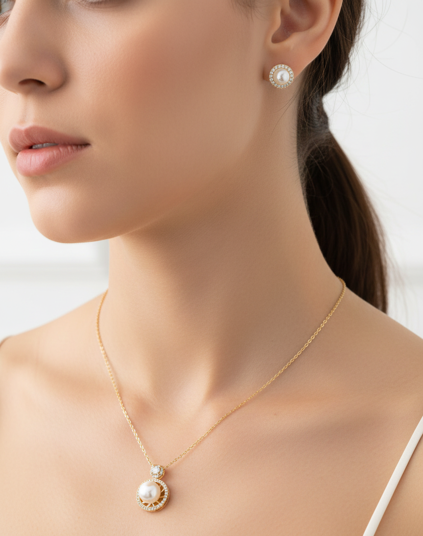 Enhance your elegance with this beautiful gold-plated pearl pendant necklace set, designed to bring timeless charm and modern sophistication together. The set features a round pearl pendant, gracefully encircled with shimmering crystal stones, suspended on a delicate gold-toned chain. The matching pearl stud earrings, also bordered with crystals, complete the look with understated luxury.