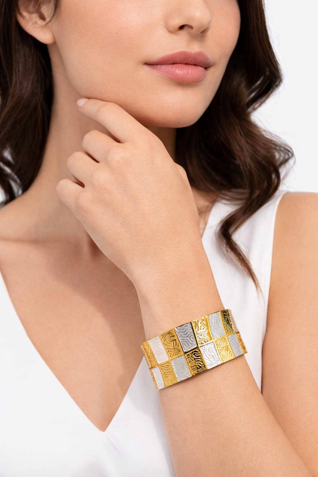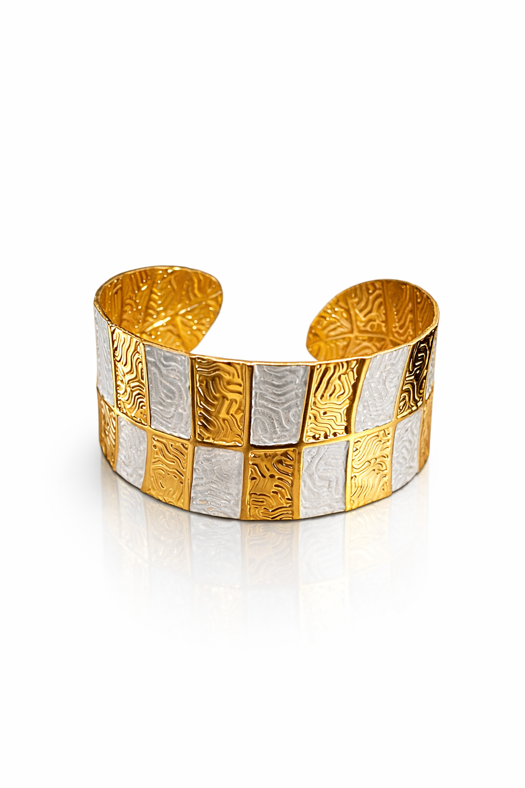 A bold dual-tone gold and silver adjustable cuff bracelet with textured designer panels, offering a luxurious statement look for festive, party, and elegant everyday styling.