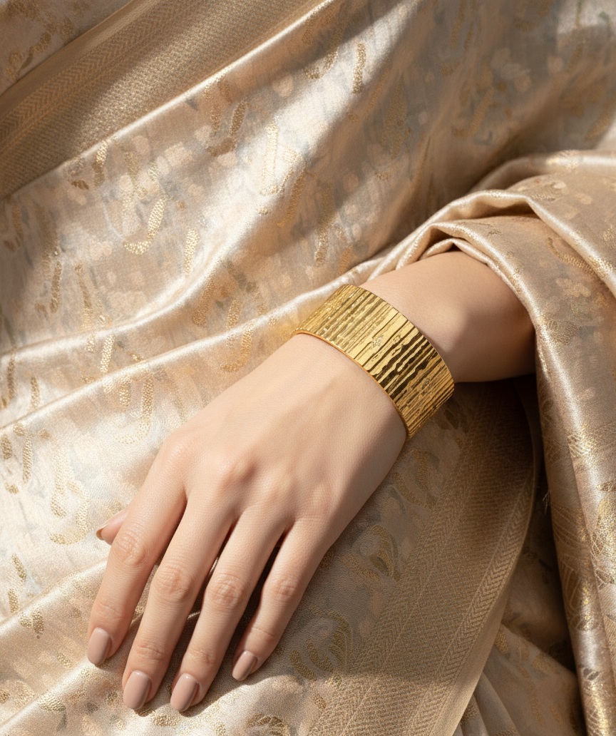 Elevate your everyday and festive look with this elegant adjustable cuff bracelet for women. Crafted with a premium gold finish, this bracelet features a unique textured surface that reflects light beautifully, giving it a luxurious and modern appeal. The open cuff design ensures a comfortable and adjustable fit for most wrist sizes, making it easy to wear and remove. Perfect for parties, weddings, office wear, or casual outings, this bracelet adds a bold yet graceful touch to any outfit. Designed to be lightweight, durable, and skin-friendly, it is an ideal accessory for women who love timeless fashion with a contemporary edge.