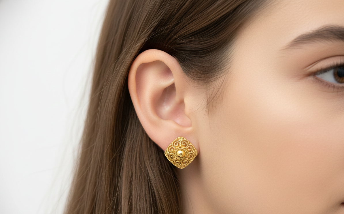 Elevate your jewellery collection with these Textured Square Gold Stud Earrings, crafted to reflect timeless elegance with a modern touch. Featuring a beautifully detailed surface inspired by traditional motifs, these studs bring a subtle antique charm while maintaining a contemporary silhouette.